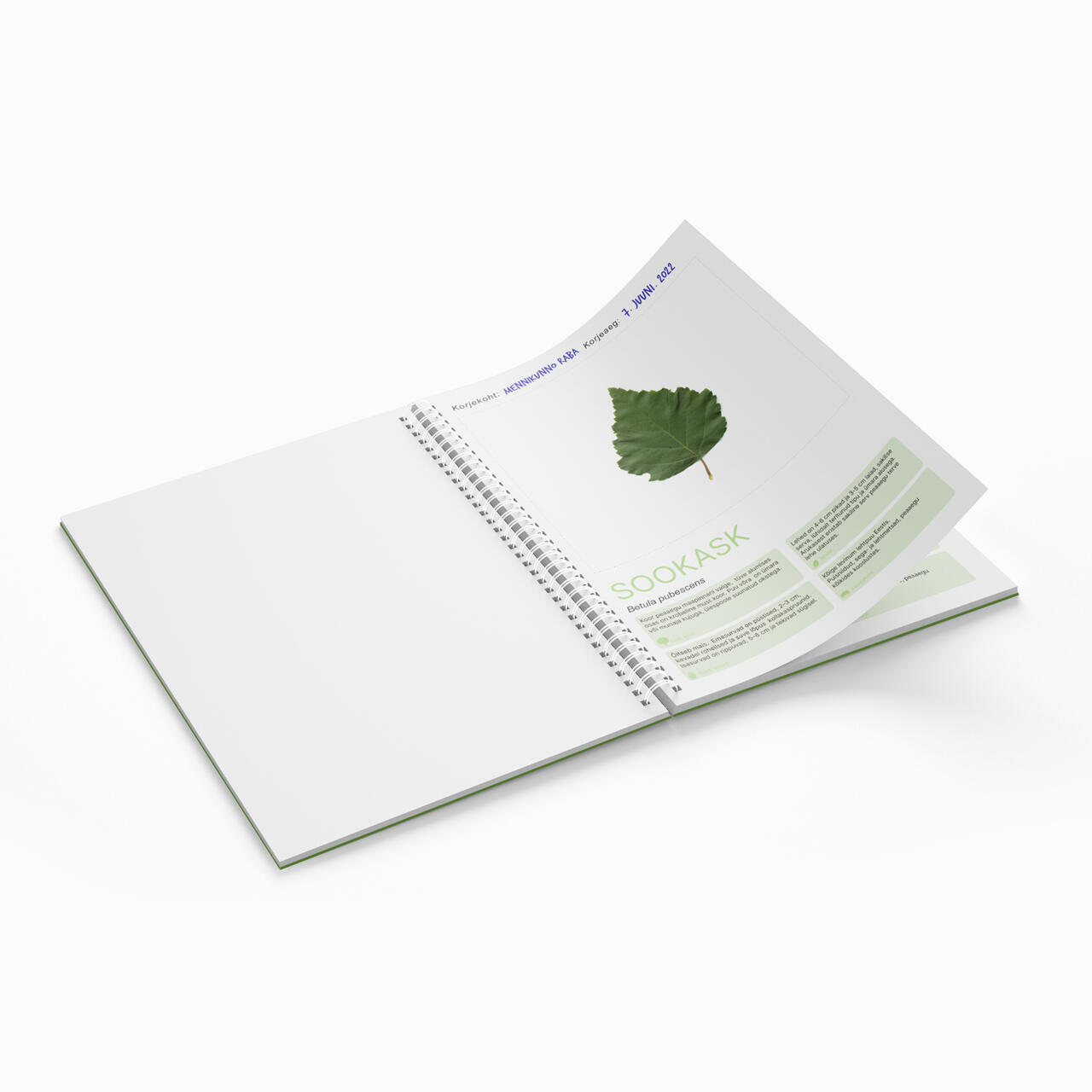 Infoga eeltäidetud kammköites herbaariumi töövihik erinevate puulehtede korjamiseks ja säilitamiseks.