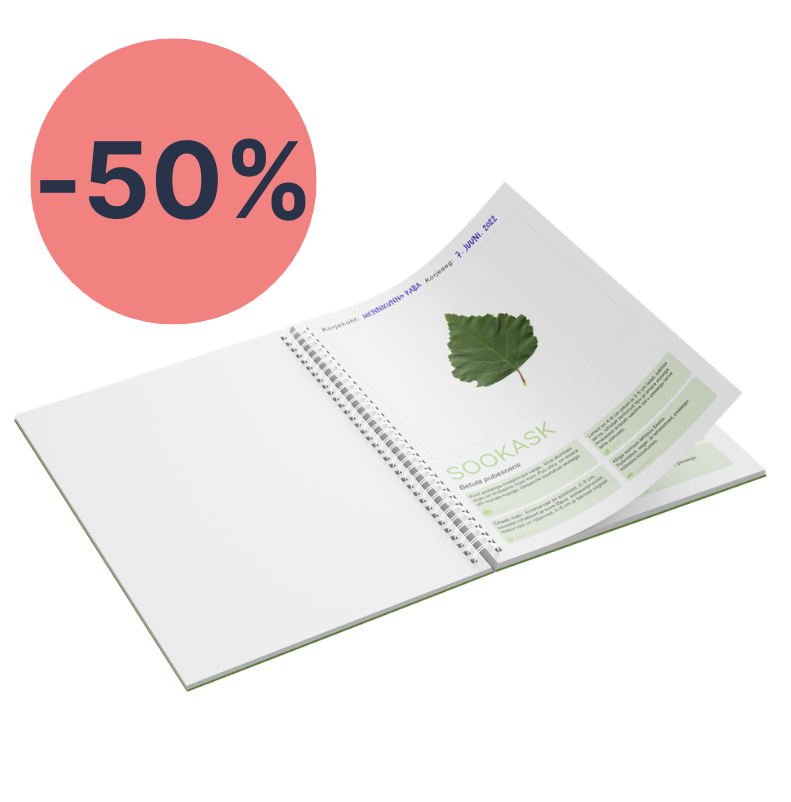 Infoga eeltäidetud kammköites herbaariumi töövihik erinevate puulehtede korjamiseks ja säilitamiseks.