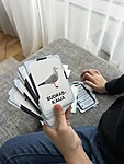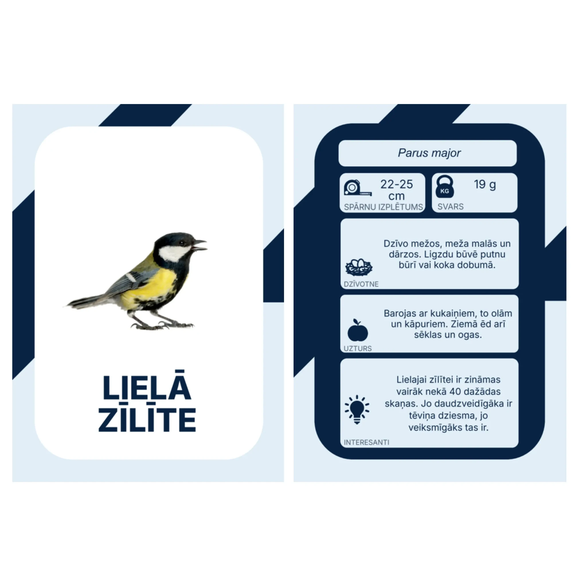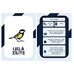 Kartīšu priekšpusē redzams putna attēls un sugas nosaukums. Otrā pusē ir informācija par putnu.