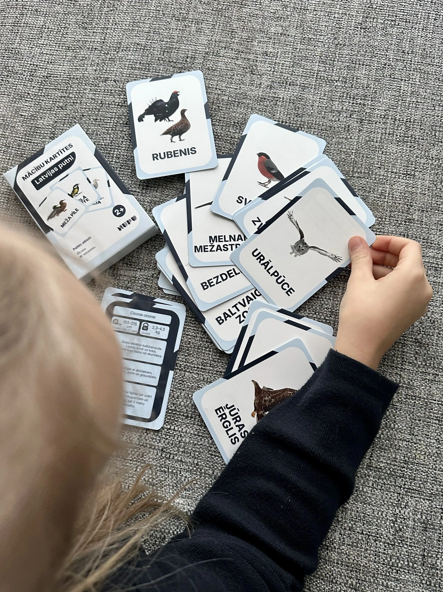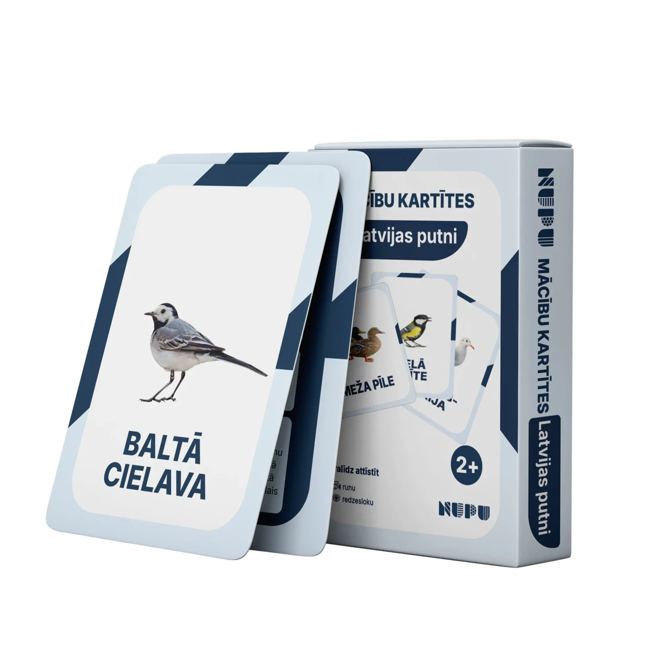 30 mācību kartītes: pelēkā vārna, lauku balodis, mājas strazds, sudrabkaija, lielā zīlite, svilpis, melnais mežastrazds, bezdelīga, baltvaigu zoss, paugurknābja gulbis, meža pīle, parastā žubīte, sarkanrīklīte, koku čipste, vītītis, rubenis, mežirbe, urālpūce, ķīvīte, lauku cīrulis, baltais stārķis, mājas zvirbulis, baltā cielava, jūras ērglis, zeltgalvītis, žagata, dzeguze, melnā dzilna, šīlis, svīre.